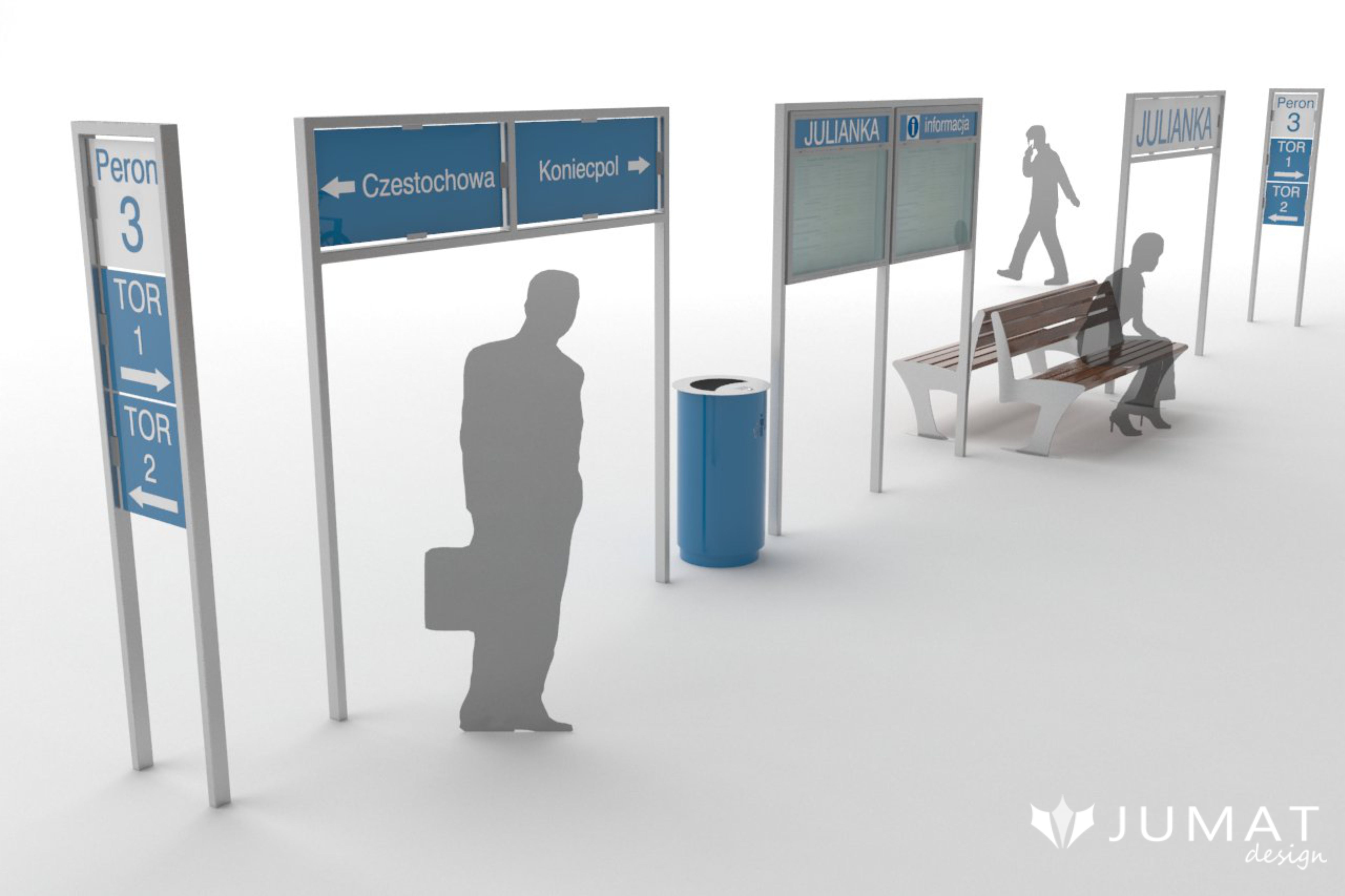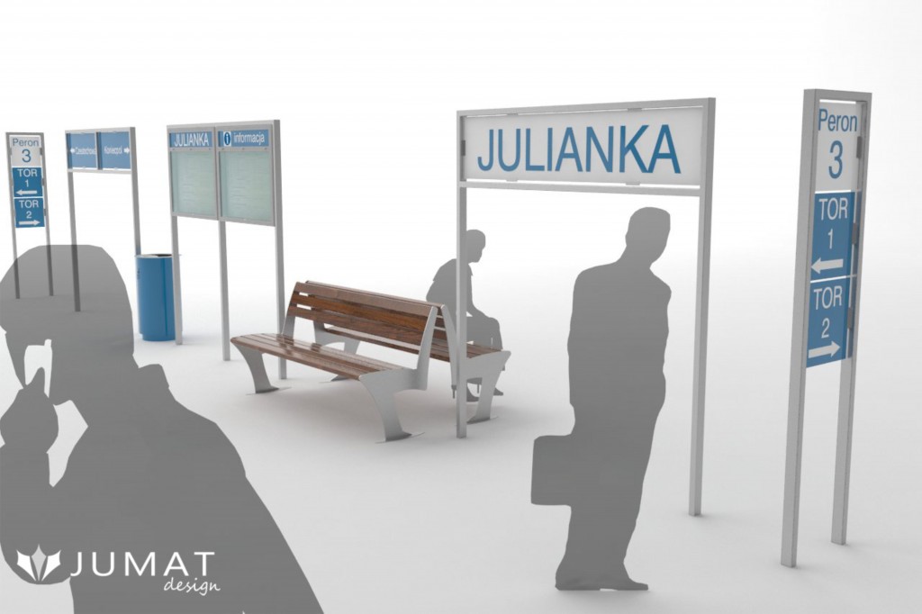 Prezentowany zestaw małej architektury miejskiej to ławki parkowe Sekwana, kosze uliczne Miasto, tablice i gabloty informacyjne Modern z nazwą stacji i peronów. To przykładowe elementy architektury miejskiej, które można zastosować przy rewitalizacji dworców kolejowych.