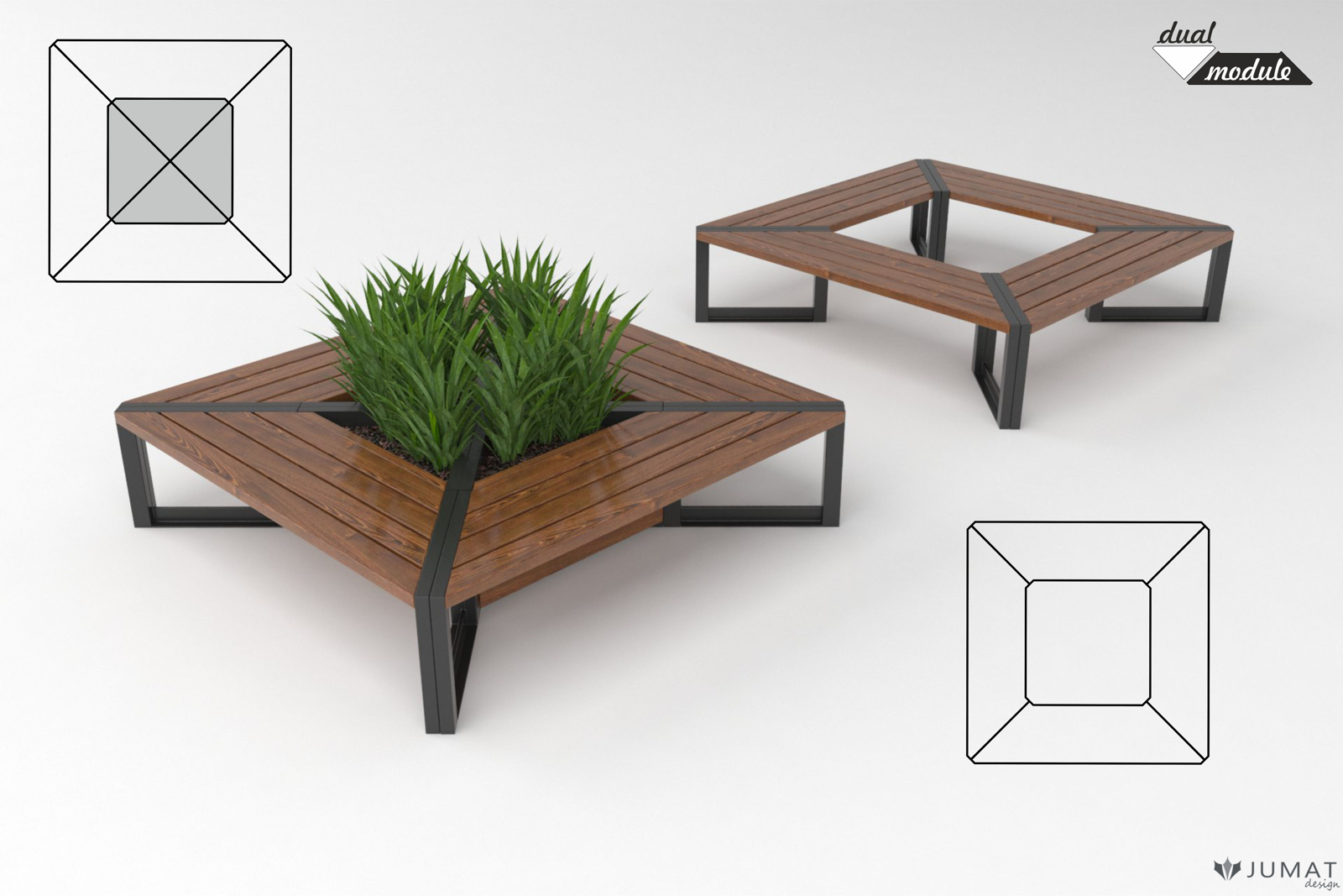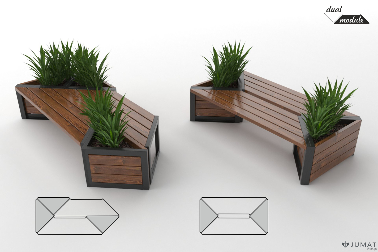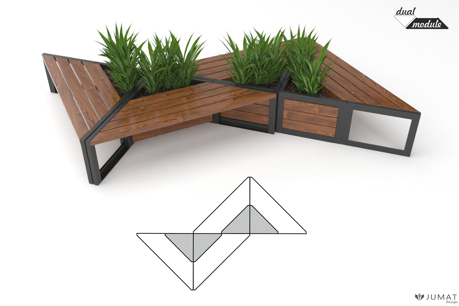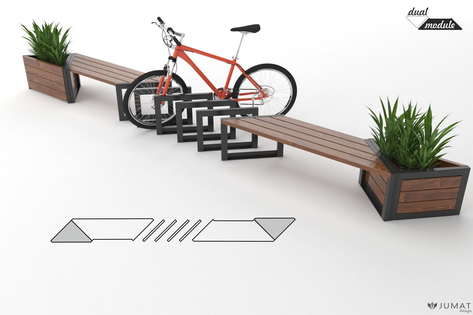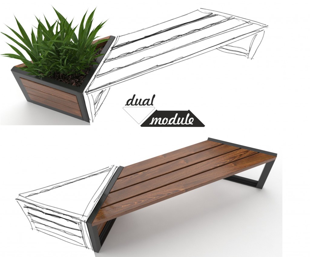 Ławki parkowe, donice miejskie, stojaki na rowery kolekcji Modern DUAL to zestaw elementów małej architektury, którą można montować w dowolny sposób tworząc spójny moduł mebli miejskich