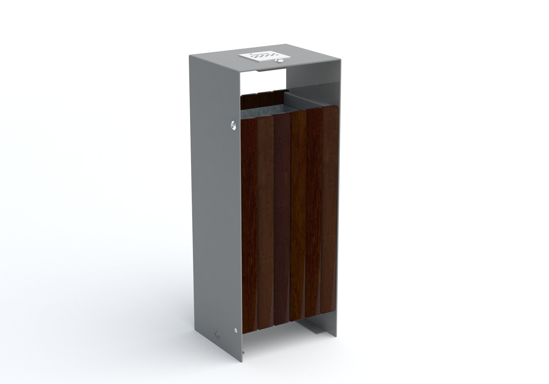 Kosze parkowe Efekt produkowane są ze stali lakierowanej proszkowo lub alternatywnie ze stali nierdzewnej. Pojemniki na odpady kolekcji efekt z wypełnieniem z listew z drewna do wyboru: jodła, jesion, dąb lub egzotycznego, kosze uliczne wyposażone w wkład stalowy z popielnicą, przystosowane do montażu przez postawienie, przykręcenie lub zabetonowanie.